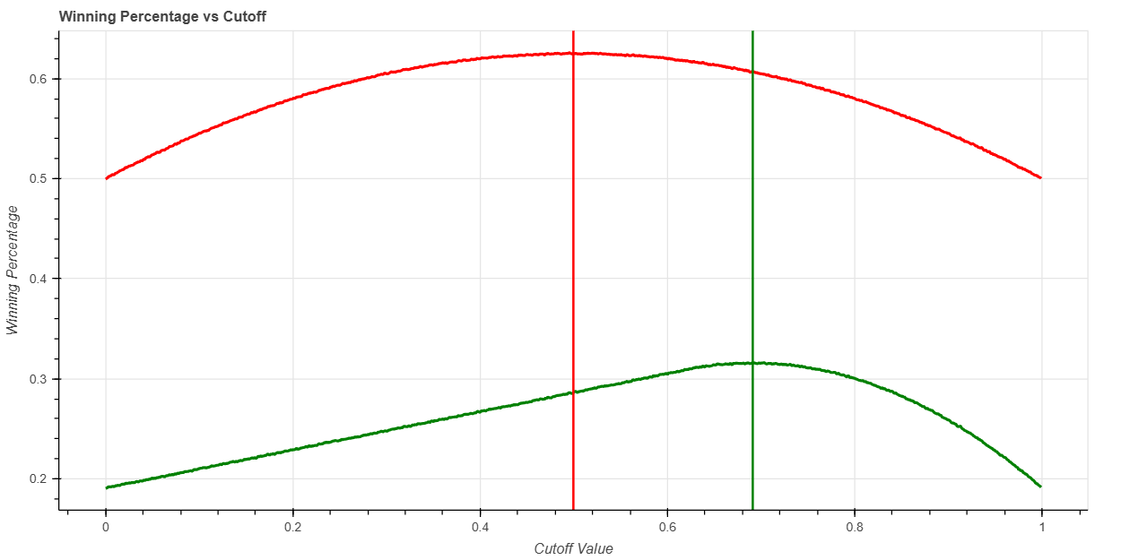 The results of a Monte Carlo simulation are above. The red and green maxima are located at approximately $0.5$ and $0.691$, respectively, verifying the calculations.